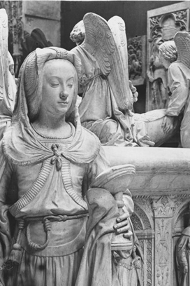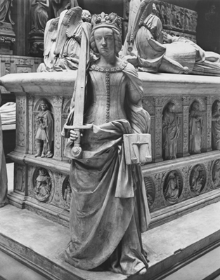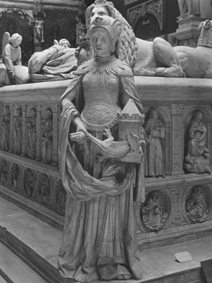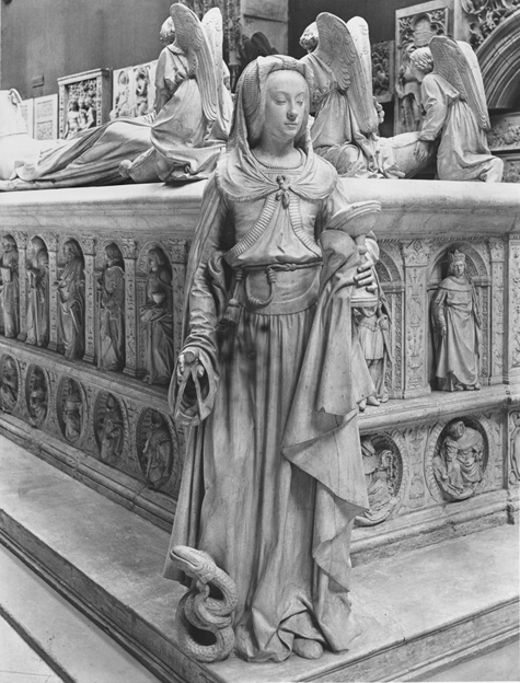 The tomb this figure decorates was commissioned in 1502 by Anne of Brittany, Queen of France, to honor her parents. This particular figure of Prudence is identified as a portrait of Anne herself. Contemporary poets praised Anne's prudence as her chief virtue. The sculptor Michel Colombe, working in the late Gothic tradition at the dawn of the Renaissance, chose to represent her and her namesake virtue not as a static symbol, but as a dynamic figure that must be fully seen to be understood.