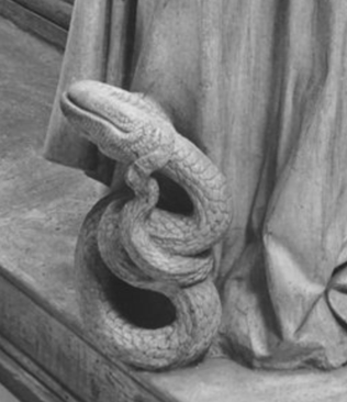 If we look down, we see a snake coiled around her right foot. Its body twisted in an ambiguous position. Is its head upside down? The snake is a traditional symbol of wisdom, but also of danger, of the knowledge of good and evil. Wisdom requires discernment.