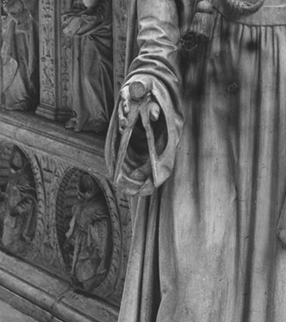 The woman’s elegant dress and posture remain the same. Behind her flowing veil, in the back of her head, is the startling image of an old man whose face emerges seamlessly yet shockingly. There is no evidence of this man from the front. He assumes no other physical form except that of an aged human face, weathered and worn, looking backward toward the tomb itself.